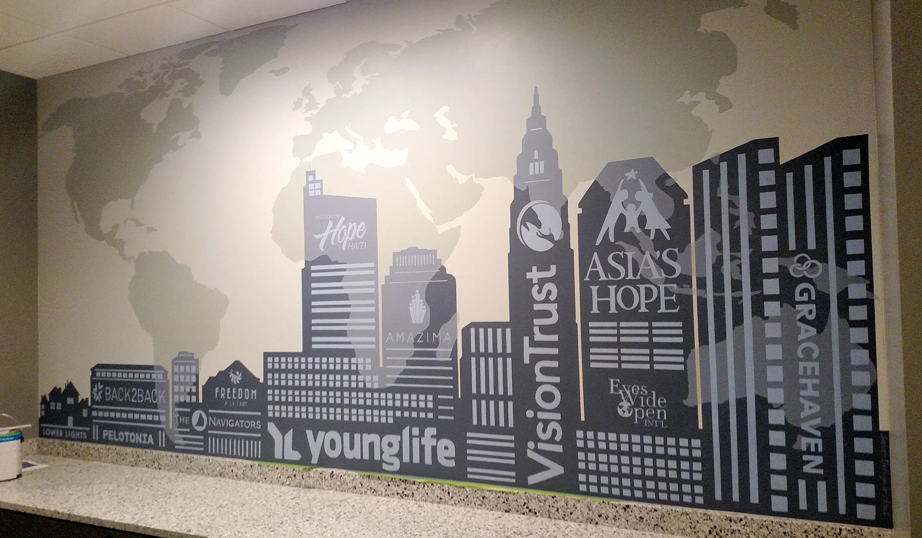 Next, I designed and painted a mural for Trinity Financial Associates. They desired a wall that celebrated the philanthropy of their own personal efforts along with their client's, encouraging generosity to whoever walked through their doors. Their giving falls both in the local and global realms, which is why a Columbus city skyline is superimposed over a global silhouette.