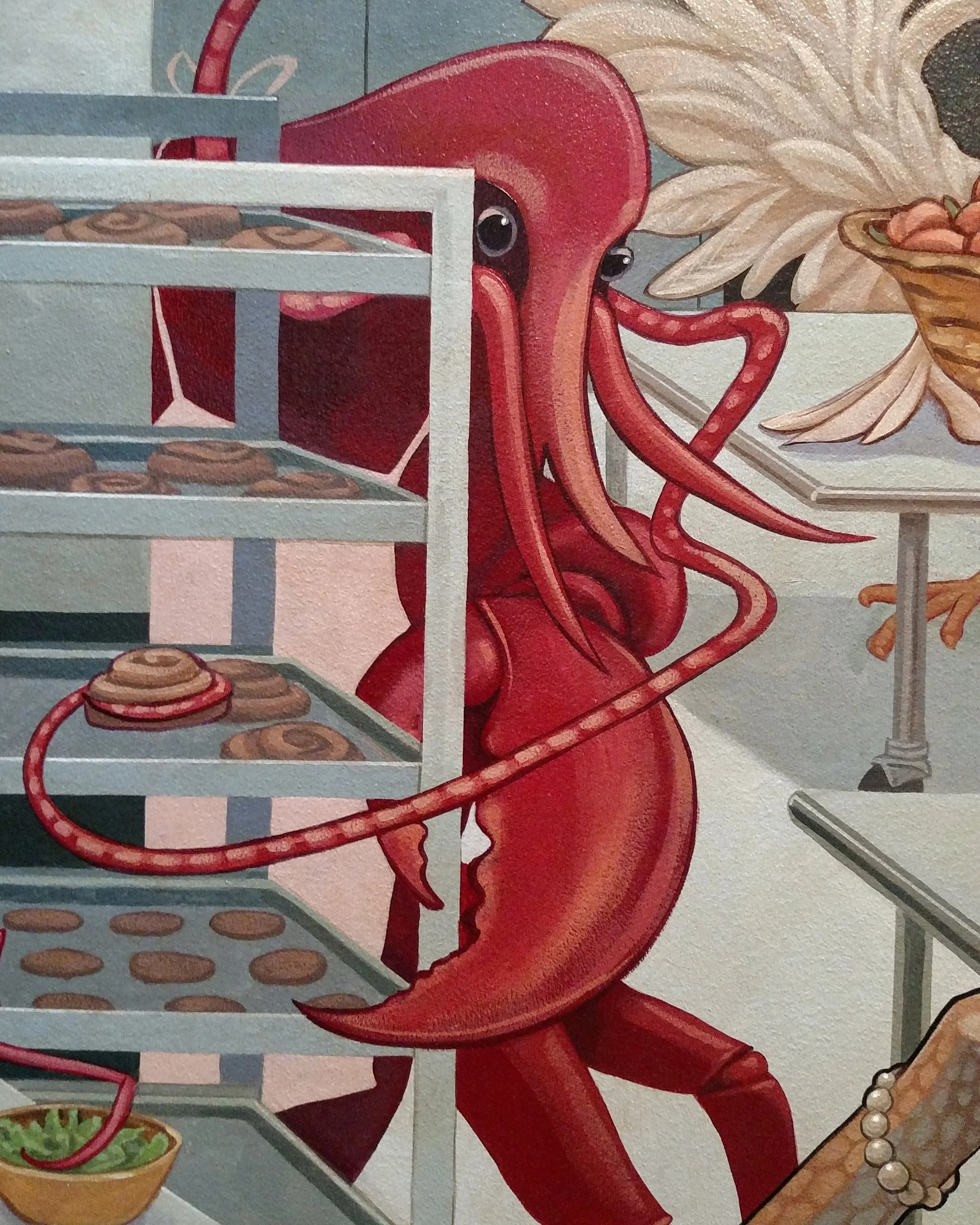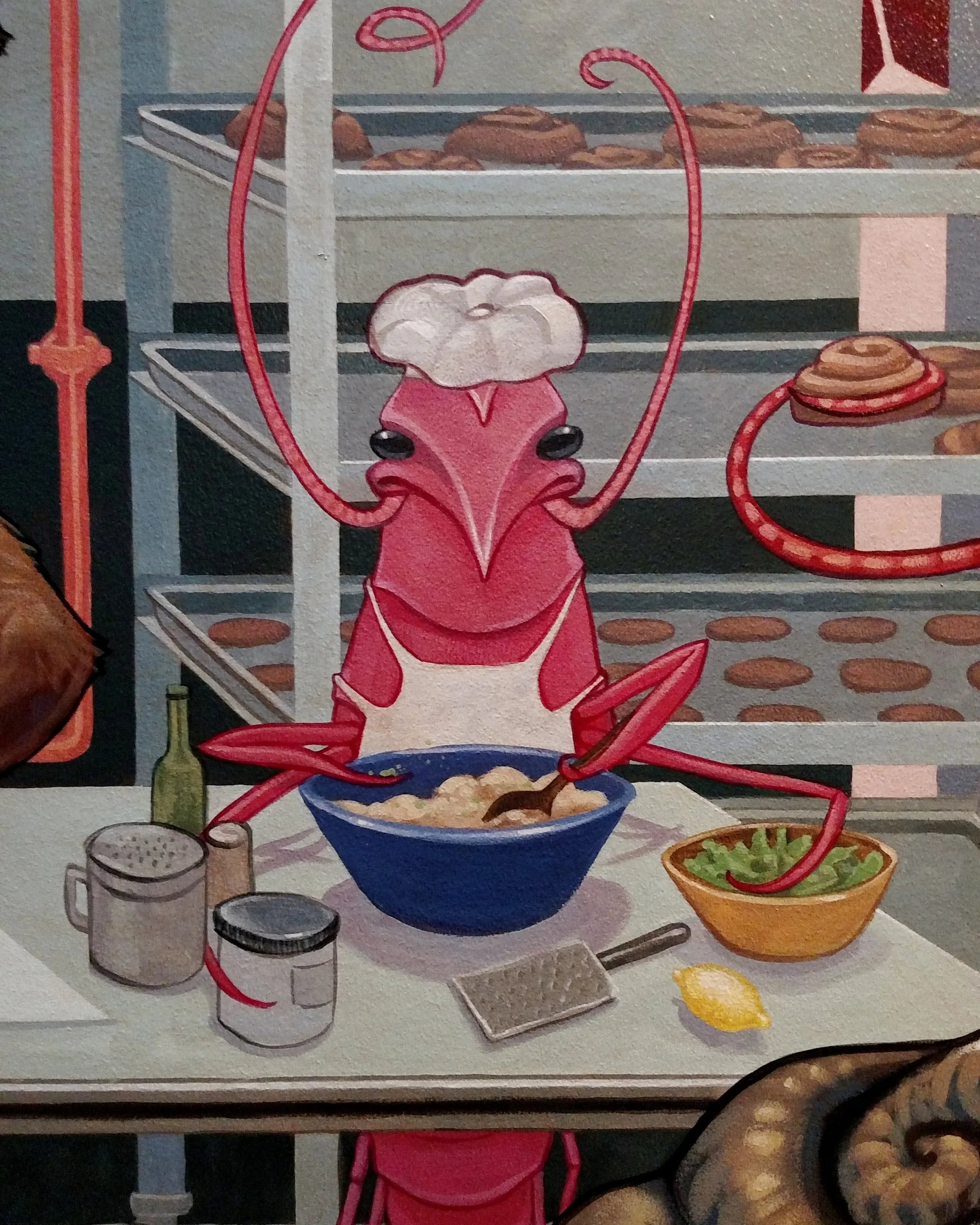 Scott thought it would be cool to see the same animals, only have a different view of them in work mode. The wall that was begging for a painting was next to the kitchen, so I went for a layout that mimicked the kitchen windows and painted the hustle and bustle of the animals at work at their craft, baking and cooking.