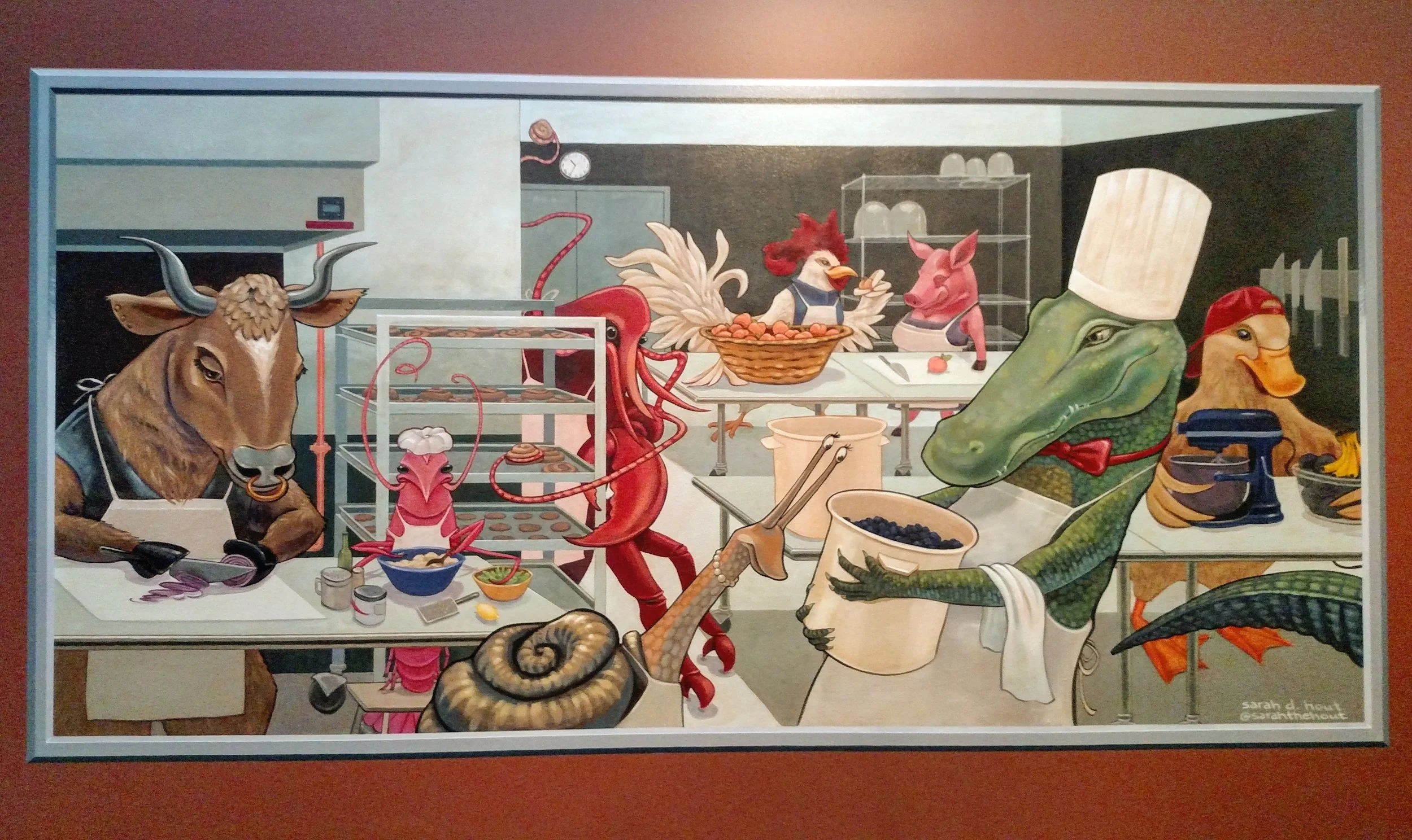 The original mural image is one of my favorite works. Upon the opening of The Commissary, I was invited to do "my own thing" as long as the design incorporated food and community. My solution was an image that incorporated animals which would typically be on the dinner plate, sitting around the table enjoying a glass of vino together.